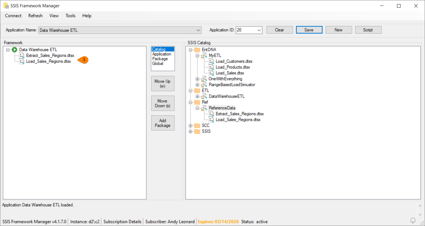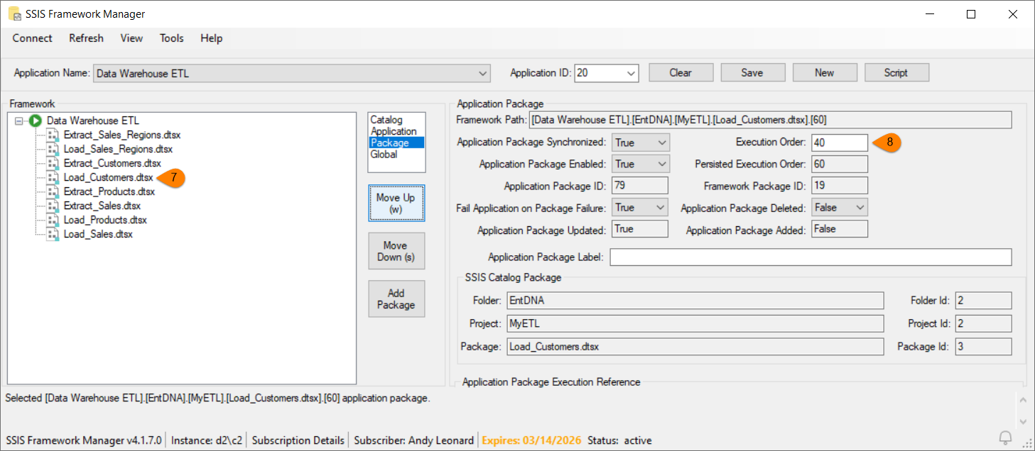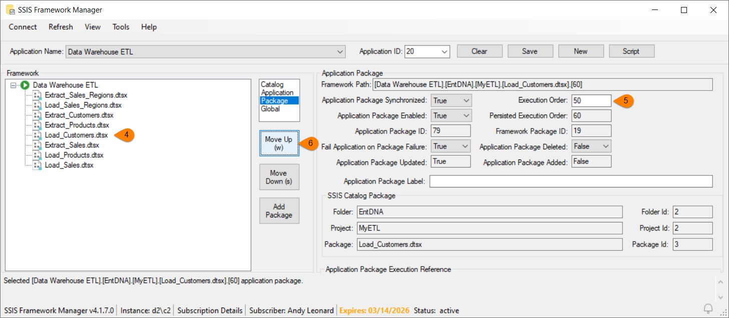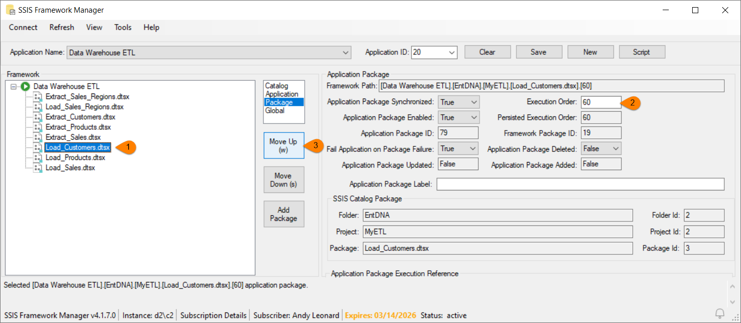 - In the SSIS Framework treeview, select the SSIS application package you wish to re-order