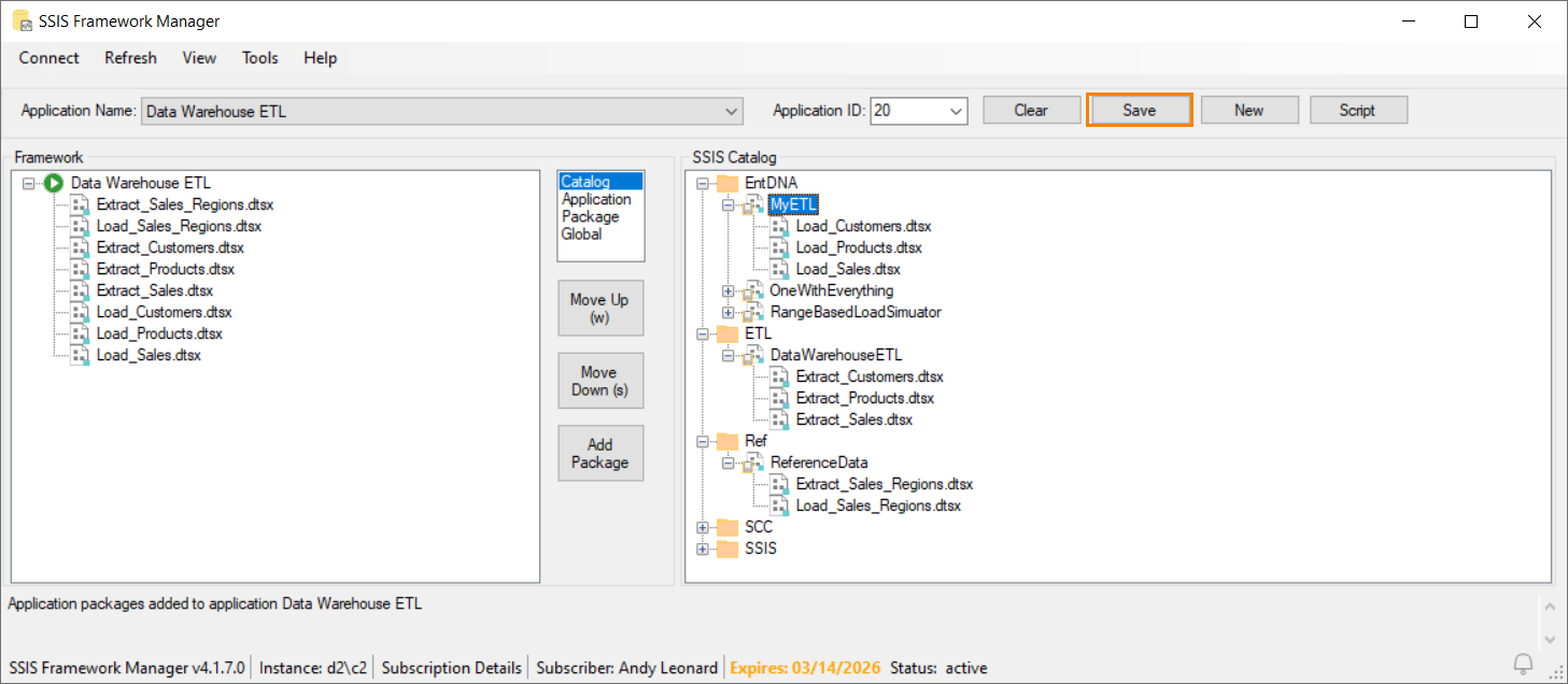Once your SSIS application has been configured, click the Save button to store the execution order of the SSIS application packages:
